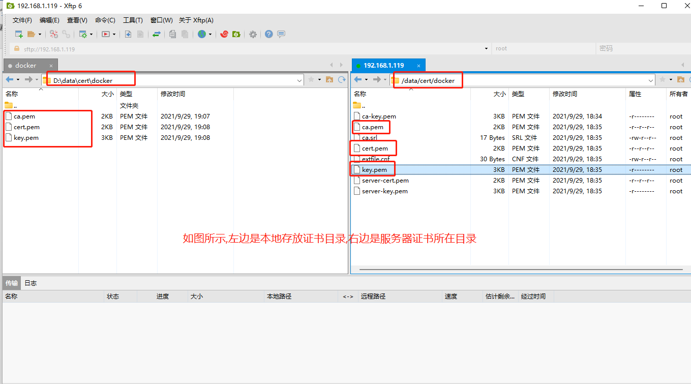 将客户端所需的ca.pem、cert.pem、key.pem 这3个密钥文件从服务器下载到本地