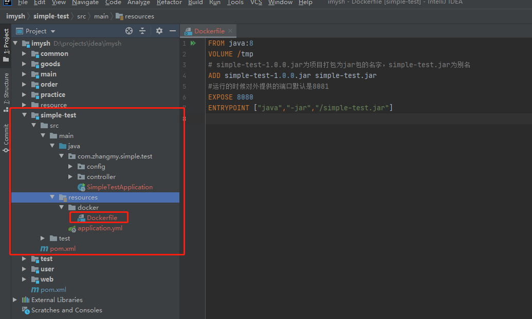 在springboot的resources目录下新建docker目录,并新建Dockerfile文件,文件内容为