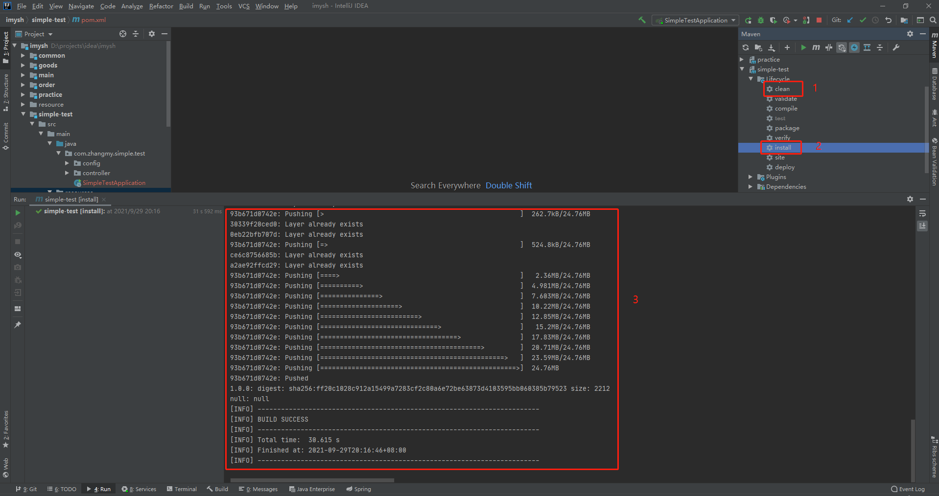 根据pom文件中的配置,只要执行mvn install命令即可自动打包成镜像并上传nexus仓库中