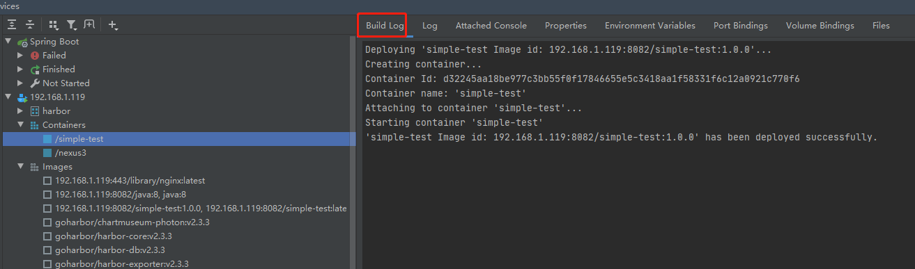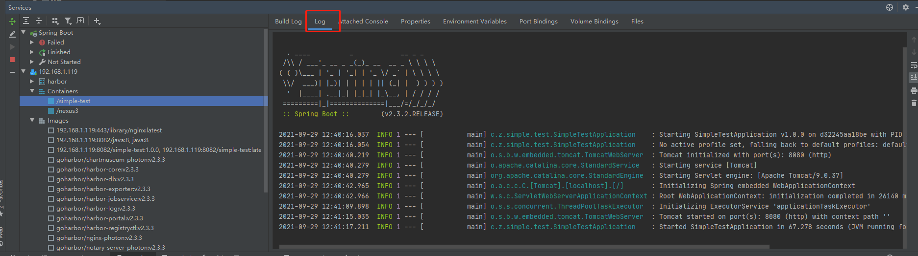 配置完成之后我们点击Run按钮即可开始运行容器并启动springboot服务