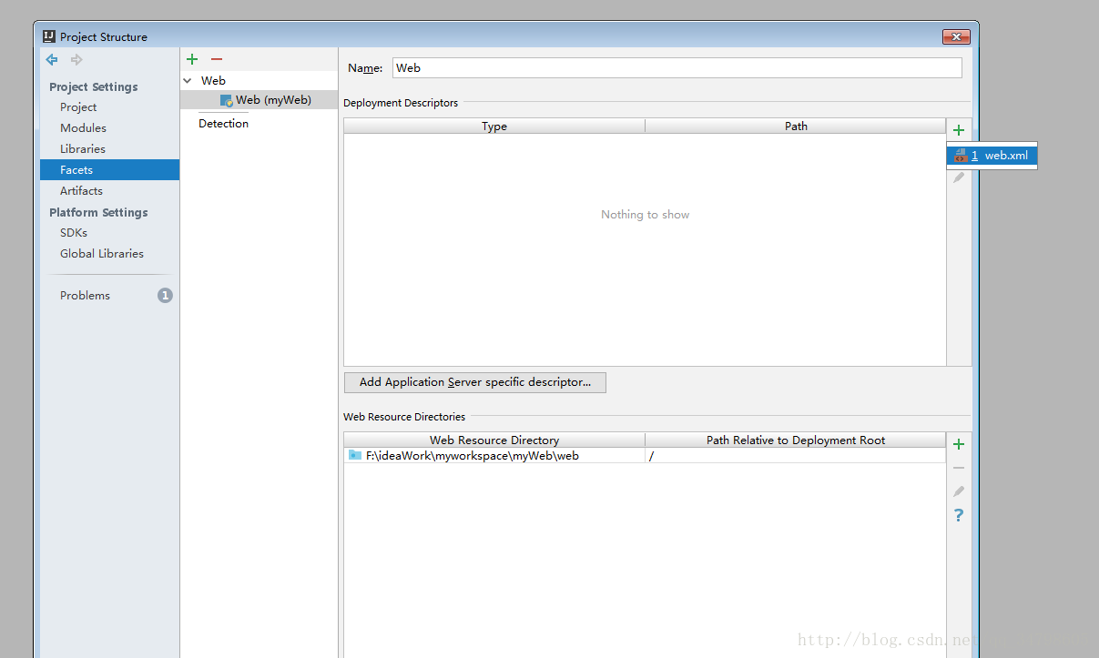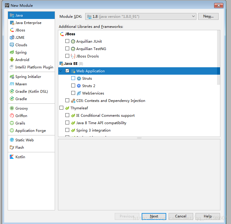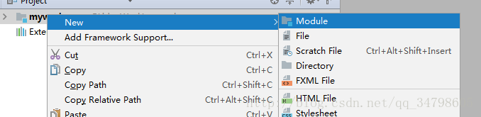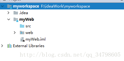 3.在工作目录中创建一个module,并勾选web应用,并且命名myWeb, 然后单击完成。