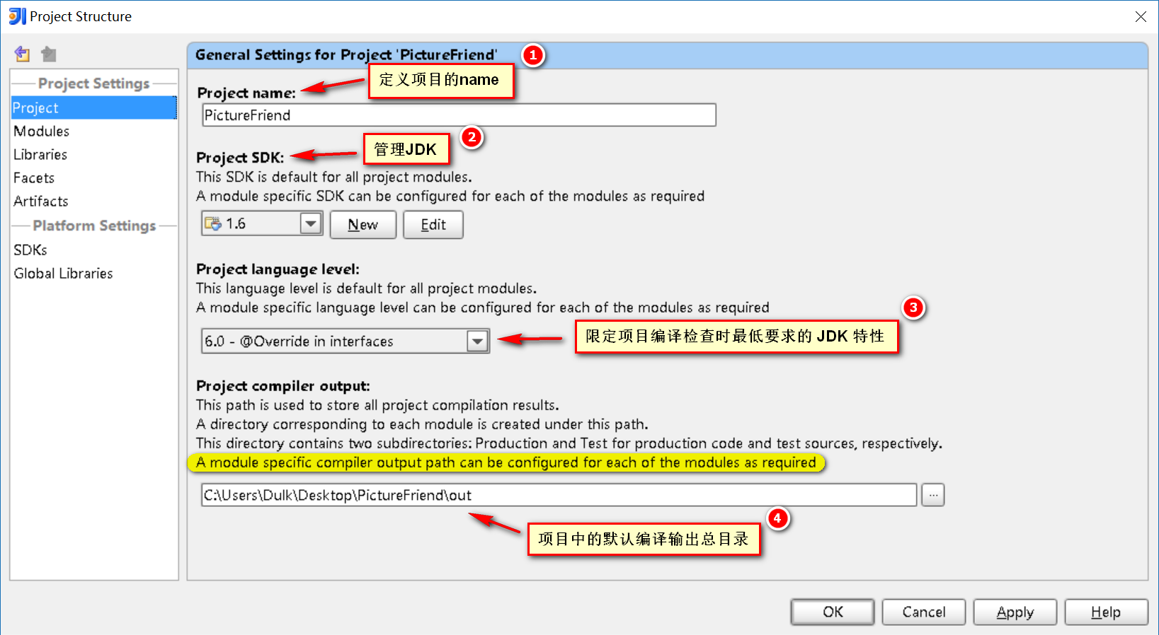 - Project language level:这个和JDK的类似,区别在于,假如你设置了JDK1.8,却只用到1.6的特性,那么这里可以设置语言等级为1.6,这个是限定项目编译检查时最低要求的JDK特性;