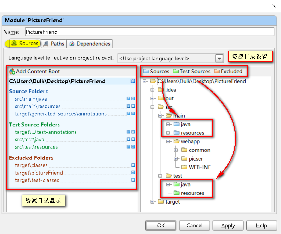 - Sources:显示项目的目录资源,那些是项目部署的时候需要的目录,不同颜色代表不同的类型;