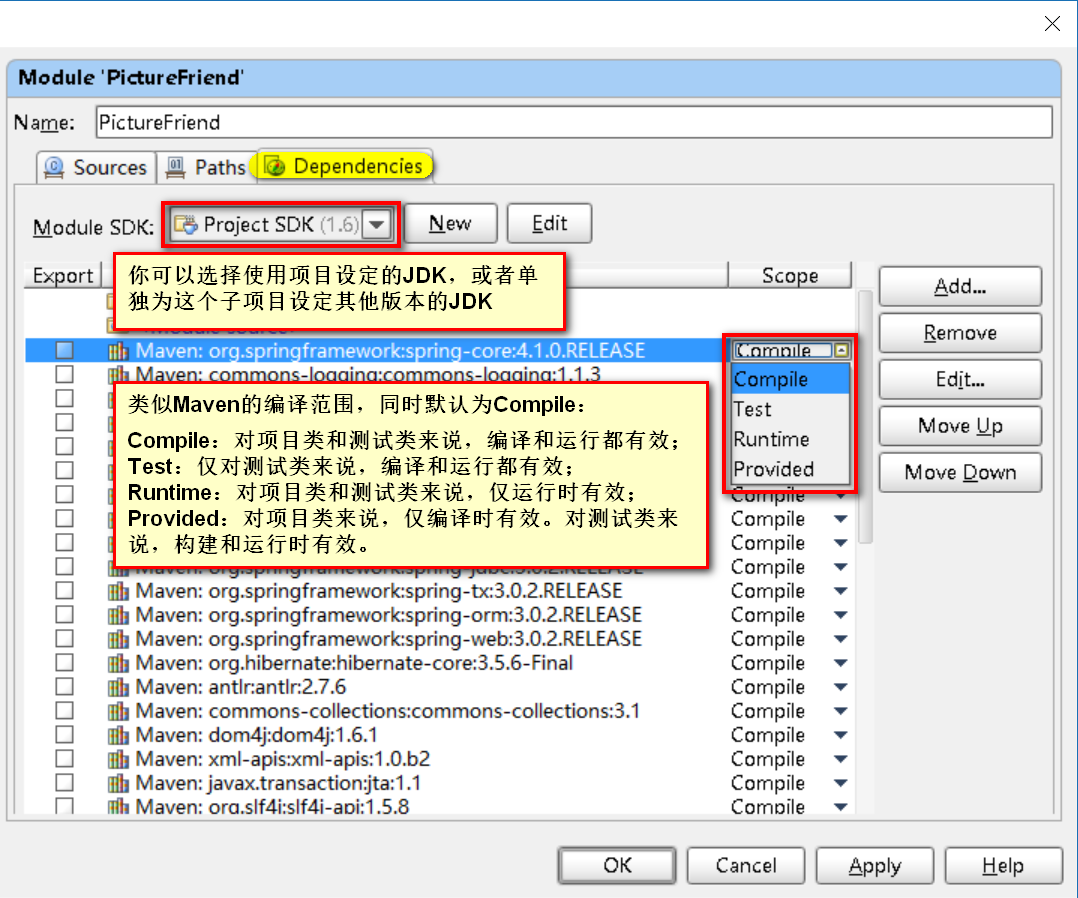 每个子项目之下都可以定义它所使用的框架,这里重点说明一下Web部分的设置。