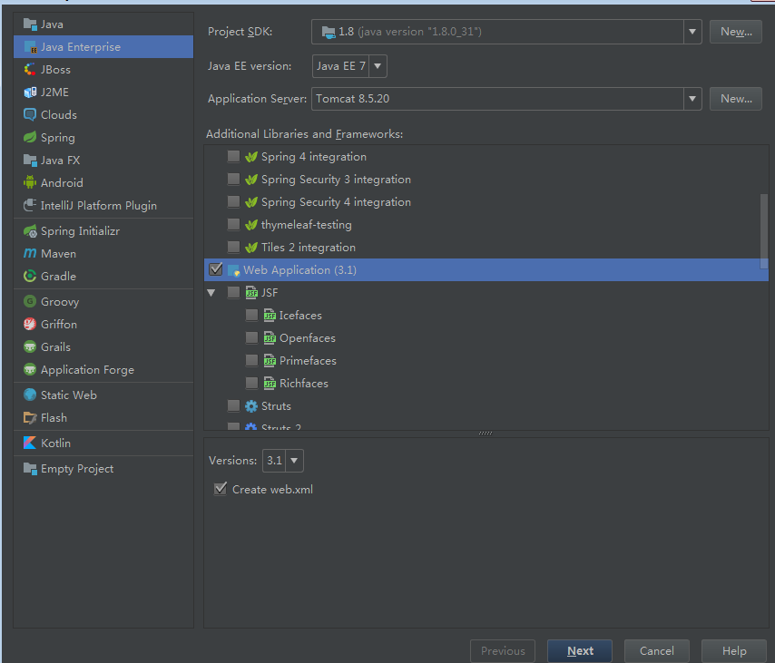选择java企业版、SDK中选择你的JDK版本、勾选Web Application