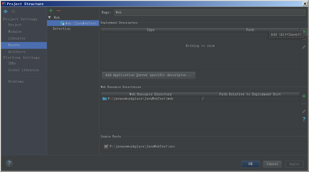2.使用Ctrl+Shift+Alt+S组合键打开ProjectStructure,点击左侧Facts,再点击Web,再点击鼠标指向的+号
