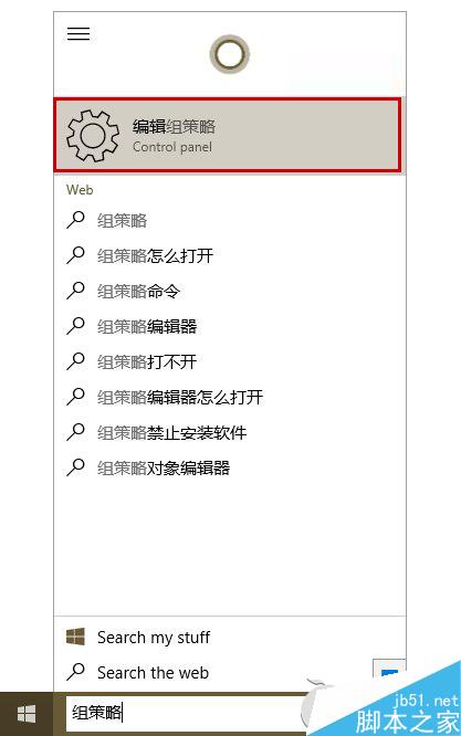 1、在Cortana搜索栏输入“组策略”或者gpedit.msc后回车,进入“组策略”设置;