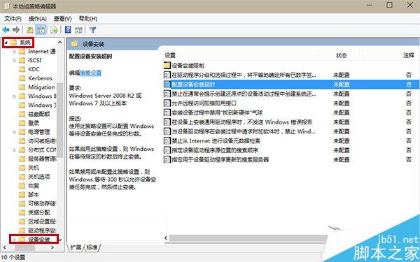 2、选择计算机配置→管理模板→系统→设备安装,然后在右边找到“配置设备安装超时”并双击打开;