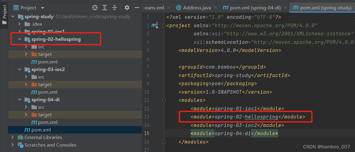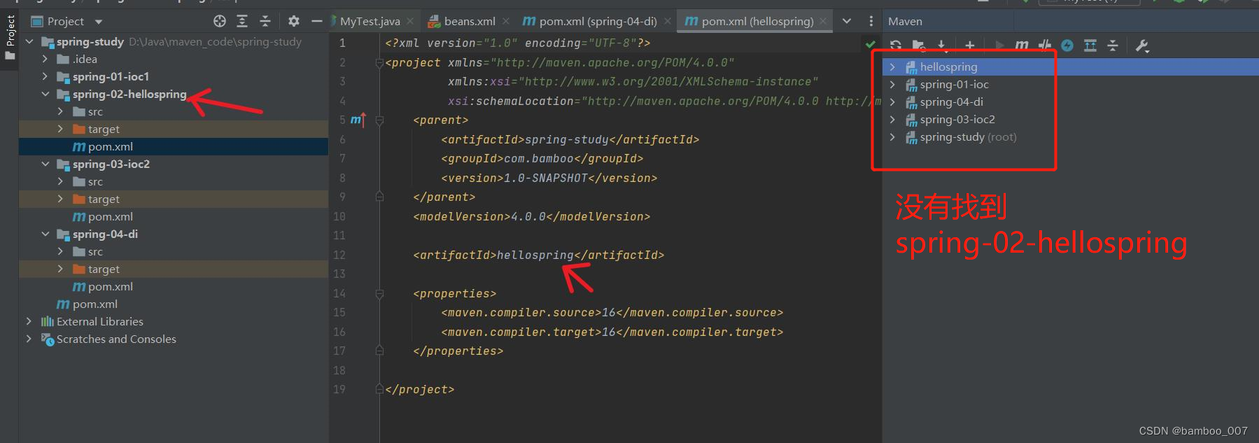一开始,我起的子mudule名称是hellospring,后来用shift+F6对其进行module和directory的rename行为,改成了“spring-02-hellospring”的子项目名称,但是在mavne的目录下没有找到spring-02-hellospring,后来才发现是子module的pom.xml中的<artifactId>没有改名字以及在父module中的相对应的子项目名称没有改,便对其进行了修改。
