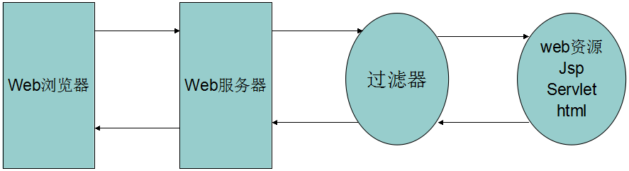 Servlet API中提供了一个Filter接口,开发web应用时,如果编写的Java类实现了这个接口,则把这个java类称之为过滤器Filter。通过Filter技术,开发人员可以实现用户在访问某个目标资源之前,对访问的请求和响应进行拦截,如下所示: