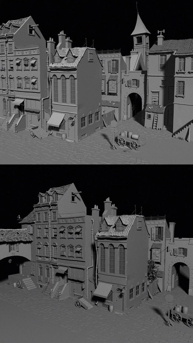 图04-05是左边和右边场景的粘土渲染图,还有一些额外的细节。所有的模型都是多边形制作的,其中很多,包括屋顶瓦片,窗户或者烟囱都可以用来扩充场景的空间。屋顶瓦片的旋转和位置都是随机摆放的,但还是要谨慎。我甚至删除了一些屋顶,产生屋顶倒塌的效果。