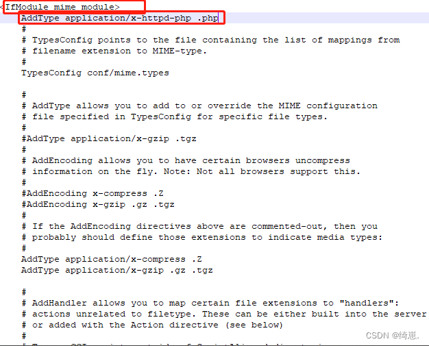 找到<IfModule mime_module></IfModule>下的,添加AddType application/x-httpd-php .php