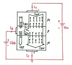 这三个区域从上到下分别是:集电区,基区(一般做的很薄)和发射区,有三个电极,分别由三个区引出,对应地称为:集电极,基极和发射极,分别用c,b,e表示
