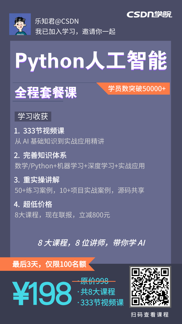 《Python 人工智能全程套餐课》是CSDN专为准备入门人工智能的小白打造,帮助更多想学 AI 的小白、大学生、准工程师,从 0 系统学习人工智能。它共计330节视频课,通过60余天的学习,带你从 0 掌握:Python编程+基础数学理论+机器学习&深度学习理论及算法+10完整项目实战。最终成功入门人工智能工程师!