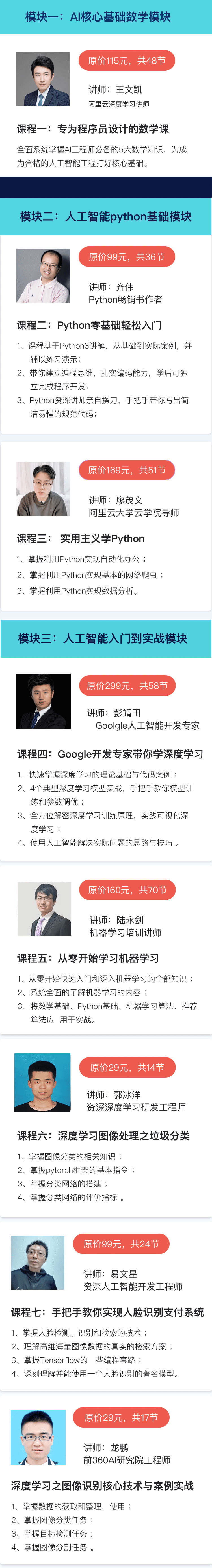 8 大课程,共分为 3 大模块,通过330节视频课,让你通过正确的学习路径,系统掌握AI工程师必备的知识体系。