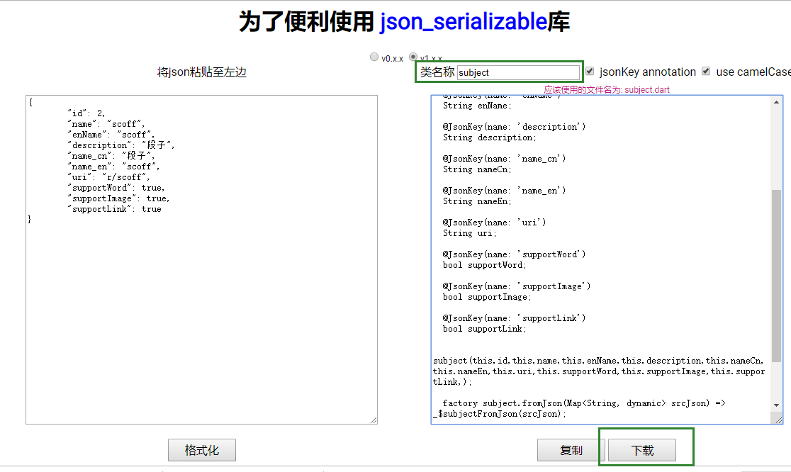 可以使用json_serializable库,将json 拷贝进去自动生成(简单json可以生成,在嵌套一层便会提示“不是一个正确的json”,不是特别好用)