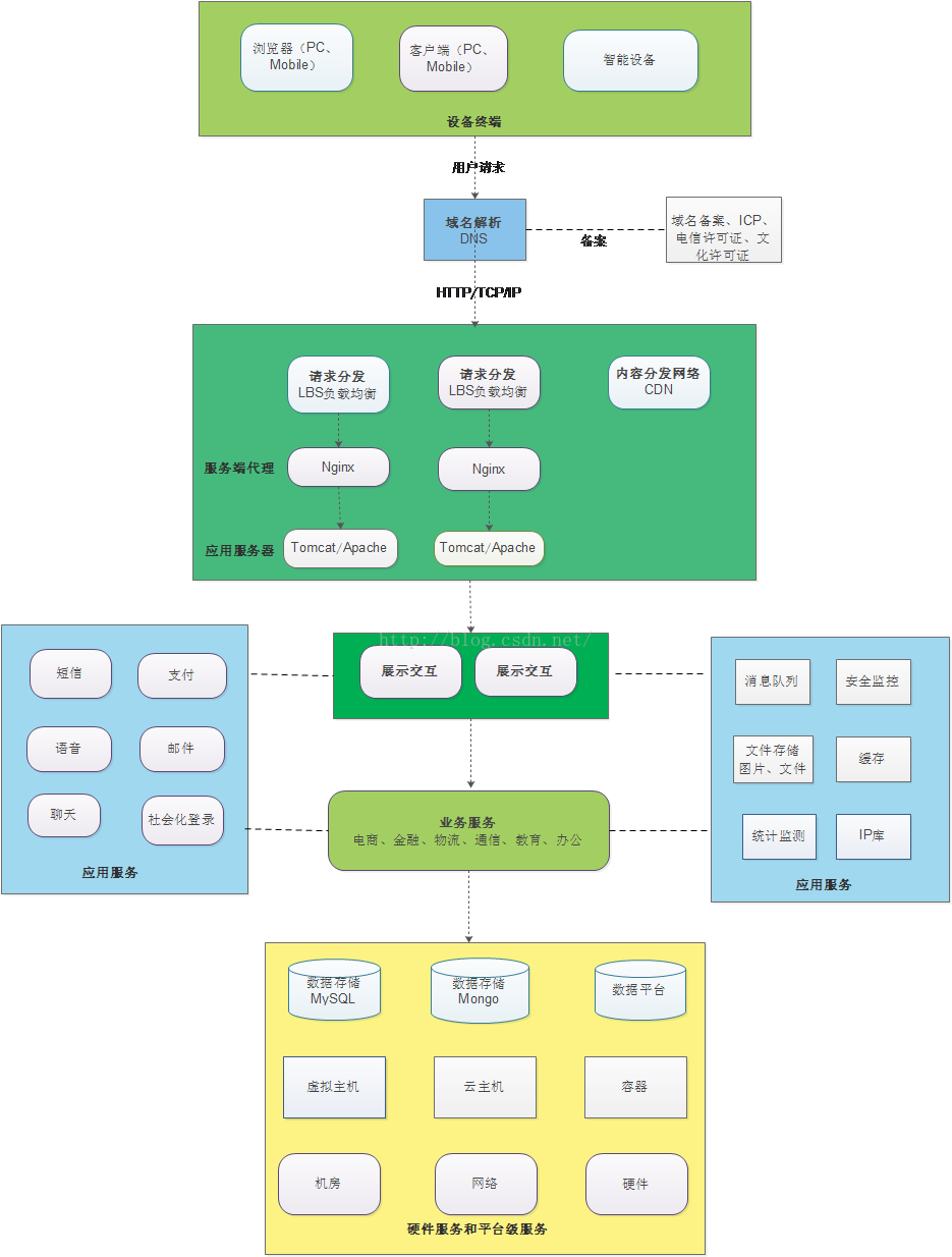 需要特别说明的是,随着互联网的发展,出现了各种各样的SaaS平台,第三方API,第三方可用服务,展示交互层和业务服务层,可以调用第三方的API,满足自身的需求。