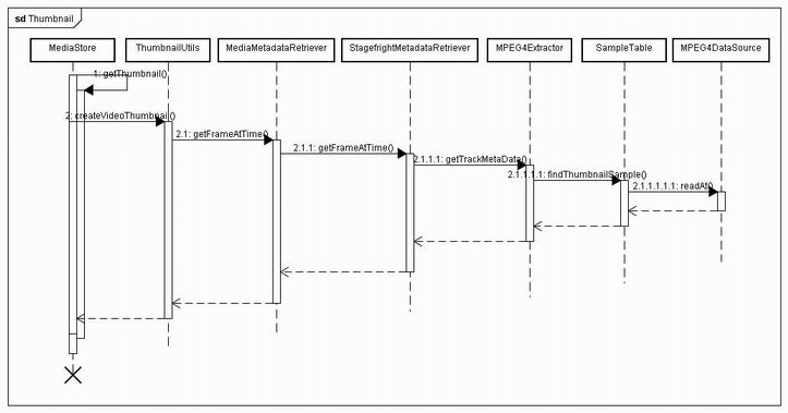 取得video thumbnail的处理流程如下图所示,取得image的thumbnail的处理流程类似,只是取得image thumbnail的函数变成了ThumbnailUtils.createImageThumbnail。