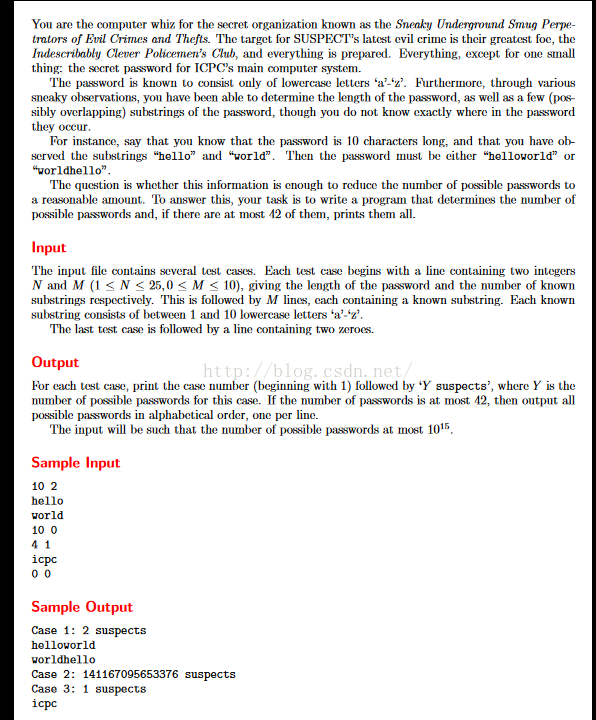 【题意】现在有个长度已知的字符串,你知道一些它的子串,问你这个字符串的可能的种数(这些子串可以重叠),如果种数 <= 42,那么就把按照字典序输出来。