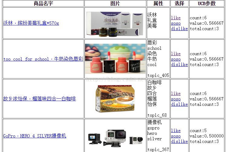 第一个商品名字是一个超链接,对应的淘宝商品,然后是图片,属性里存放的是tags和topics参数。即是商品的分类参数。
