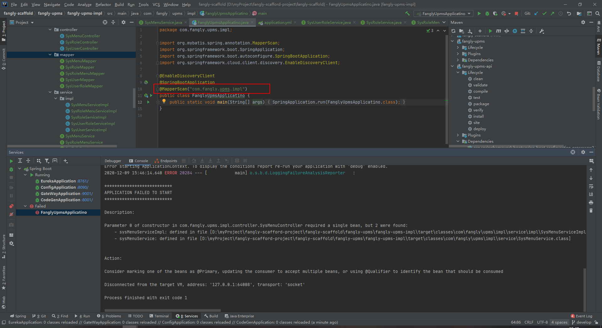 Parameter 0 of constructor in com.fangly.upms.impl.controller.SysMenuController required a single bean, but 2 were found: