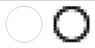 如下图,这是一个放大了1200%的屏幕,前面是告诉计算机我有一个圆形,后面就是计算机把圆形转换成可以显示的像素点。这个过程就是Rasterize。