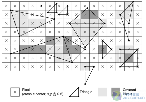 [本图出自D3D Functional Specification,链接自zol上顾杰的文章]光栅化会根据三角形顶点的位置,来确定需要多少个像素点才能构成这个三角形,以及每个像素点都应该得到哪些信息,比如uv坐标该是什么...等。这是通过对顶点数据进行插值来完成的。