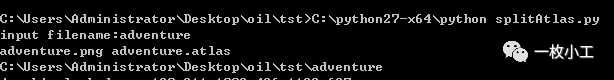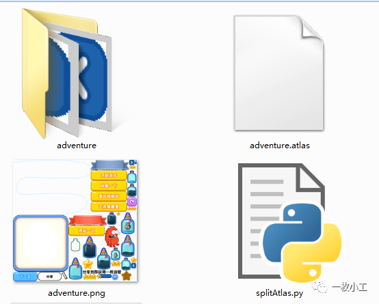 *.atlas和*.png文件,放置在脚本根目录下,执行splitAtlas.py,根据提示,输入需要拆分的大图文件名,执行完成以后,就会新创建一个和大图文件名相同的文件夹,小图都在目录下面。