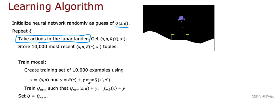 我们开发的学习算法,即使我们还在学习要如何去近似Q(s,a ) 的过程中,也是需要在月球着陆器中采取一些行动。