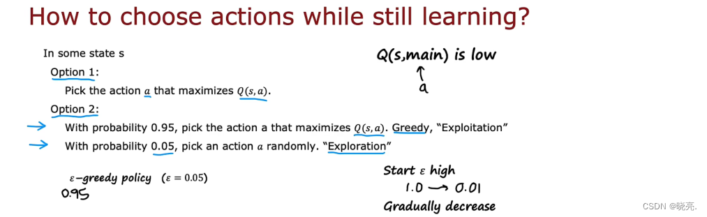 如图,这是我们之前看到的算法,该算法的步骤之一是在月球着陆器中采取行动,当算法仍然在运行时,我们并不知道每个状态采取的最佳行动是什么。但即使我们仍在学习并且还没有很好的Q(s,a )估计,我们还是需要在学习算法的这一步采取行动,怎么采取行动呢?