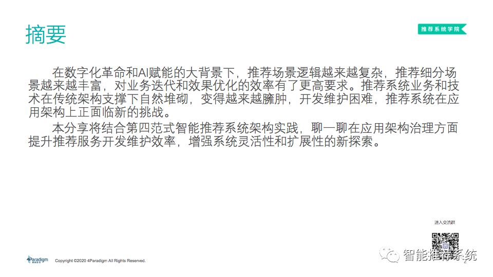 今天给大家带来第四范式平台架构师李瀚所做的直播交流,本次交流结合第四范式智能推荐系统架构实践,和大家分享了在应用架构治理方面提升推荐服务开发维护效率,增强系统灵活性和扩展性的新探索。