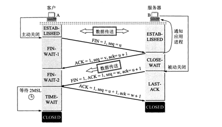 若B已经没有要向A发送的数据,其应用进程就通知TCP释放链接.这是B发出的连接释放报文段必须使FIN=1.现假定B的序号为w(在半关闭状态B可能又发送了一些数据).B还不许重复上次已发送过的确认号ack=u+1.这时B就进入LAST-ACK(最后确认)状态,等待A的确认