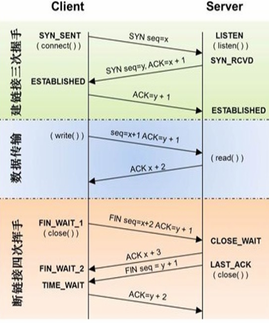 - TCP客户进程收到确认后,还要向服务器给出确认。确认报文的ACK=1,ack=y+1,自己的序列号seq=x+1,此时,TCP连接建立,客户端进入ESTABLISHED(已建立连接)状态。TCP规定,ACK报文段可以携带数据,但是如果不携带数据则不消耗序号。