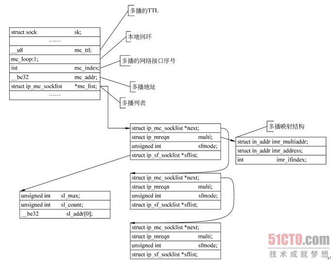 Linux内核中的多播是利用结构struct ip_mc_socklist来将多播的各个方面连接起来的,其示意图如图11.7所示。