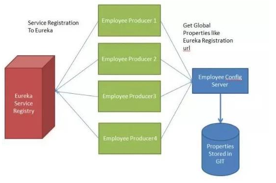 下面的例子中多个员工生产者模块从 Employee Config Module 获取 Eureka 注册的财产。