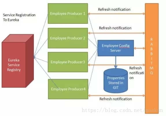 下面的例子中多个员工生产者模块从Employee Config Module获取Eureka注册的财产。