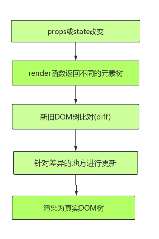 React 采用的是虚拟 DOM (即 VDOM ),每次属性 (props) 和状态 (state) 发生变化的时候,render 函数返回不同的元素树,React 会检测当前返回的元素树和上次渲染的元素树之前的差异,然后针对差异的地方进行更新操作,最后渲染为真实 DOM,这就是整个 Reconciliation 过程,其核心就是进行新旧 DOM 树对比的 diff 算法。