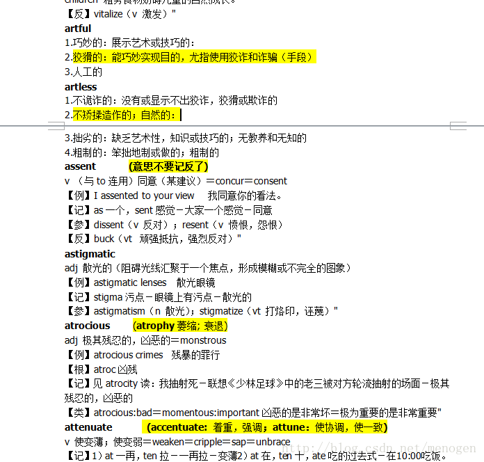 接上一篇,因为自己平时在记单词,在做填空,对于怎么也记不住的单词会列到文档,先是有释义版,不断背后,无释义版,确认记住的再逐渐删除,建议大家可以采用这种方式。在我的上传页面有一份 要命三千+陈圣元填空+24套的总结的单词,包括很重要但记不住的单词,同时也把在总结过程中觉得形似的、易混的一些单词也加进去,用黄色标出,这是自己最后最后考试前不断重复的资料,截图解解馋: