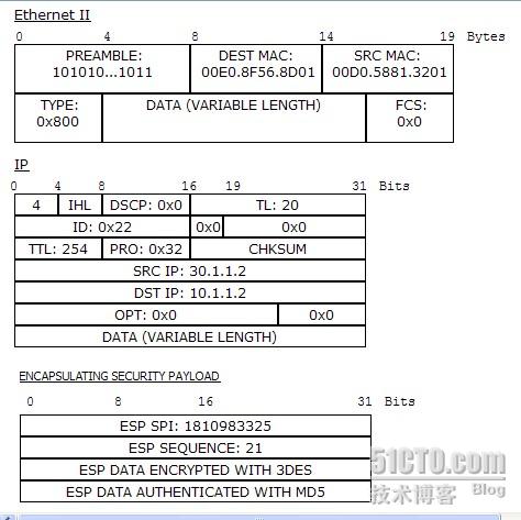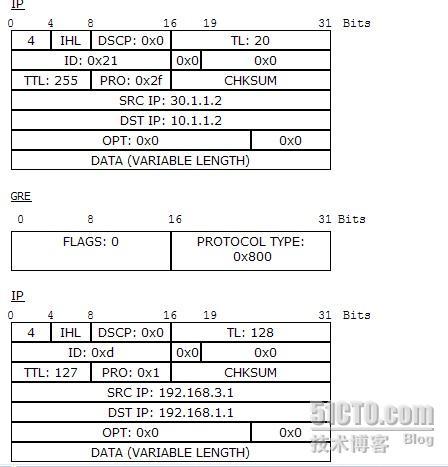和Ipsec ×××的结合使用,大致可分为:GRE Over Ipsec和Ipsec Over GRE。GRE Over Ipsec,顾名思义就是整个GRE数据被Ipsec ×××加密所承载。Ipsec Over GRE,则是Ipsec ×××的数据被GRE所承载,先用GRE快速连通网络,再利用Ipsec ×××对关键数据进行加密后再被GRE所承载,非关键数据还是明文传输的GRE。(本文以GRE Over Ipsec为例)下面是GRE Over Ipsec传输数据,用PT 5.2抓的数据包结构图: