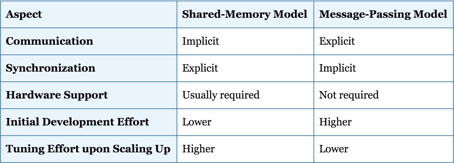 Tasks exchange data implicitly via sharing and not by explicitly sending and receiving messages.
