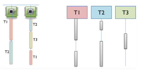 如何在只有一个或两个处理器的计算机中拥有许多并发线程?当线程数多于处理器时,通过时间片模拟并发性,这意味着处理器要在线程之间切换。下图显示了如何在只有两个实际处理器的机器上对三个线程T1,T2和T3进行时间分片。在图中,时间向下进行,因此首先一个处理器运行线程T1而另一个处理器运行线程T2,然后第二个处理器切换到运行线程T3。线程T2暂停到下一个时间片,在同一处理器或另一个处理器上。图的最右边部分显示了每个线程的视角。有时一个线程正在处理器上主动运行,有时它会被暂停,等待下一次机会,在某个处理器上运行。