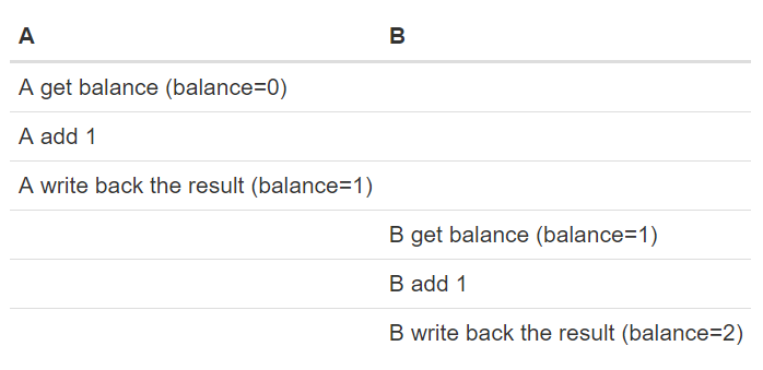 现在余额为1——A的美元已经丢失!A和B都同时读取余额,计算单独的期末余额,然后竞相存储新的余额,却未能将对方的存款考虑在内。