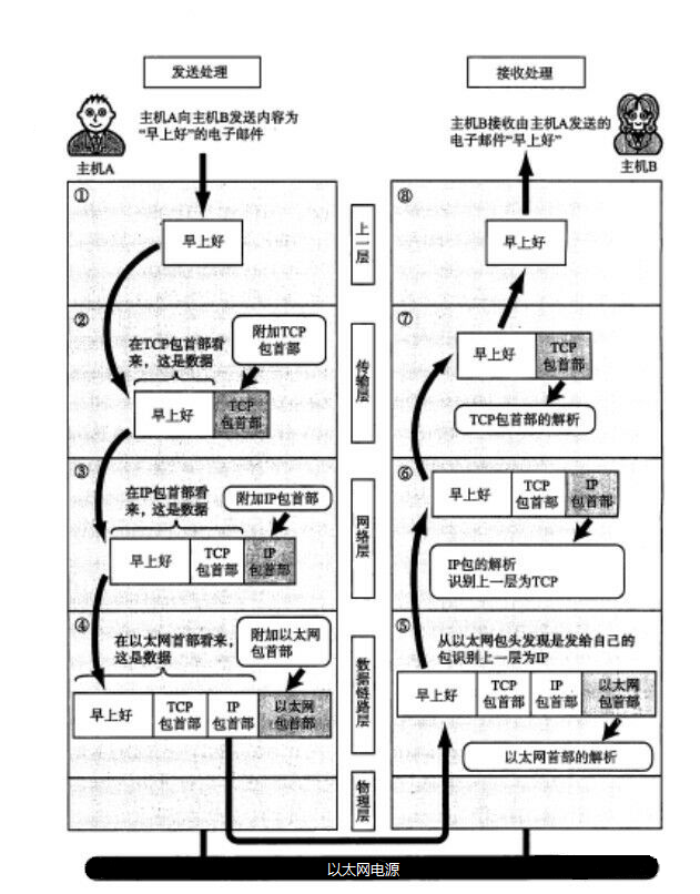 | 9)链接层:Ethernet协议 | 分割IP数据包的数据,封装成多个以太网数据包,形成数据帧,采用广播形式,通过传输介质,发送给对方主机 |