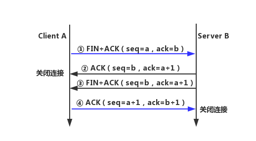 - 第四次挥手:Client收到Server的ACK报文和FIN+ACK报文之后,会响应一ACK(seq=a+1,ack=b+1),ack=b+1,表示对于Server的FIN报文的确认。