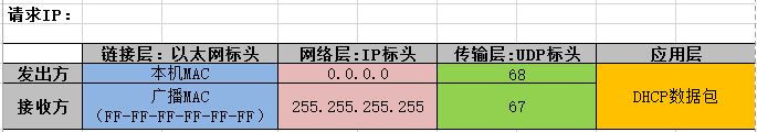 1. 广播发送给子网内所有机器关于请求IP的消息,通过网络层,DHCP接收到该消息,其他机器丢弃该包