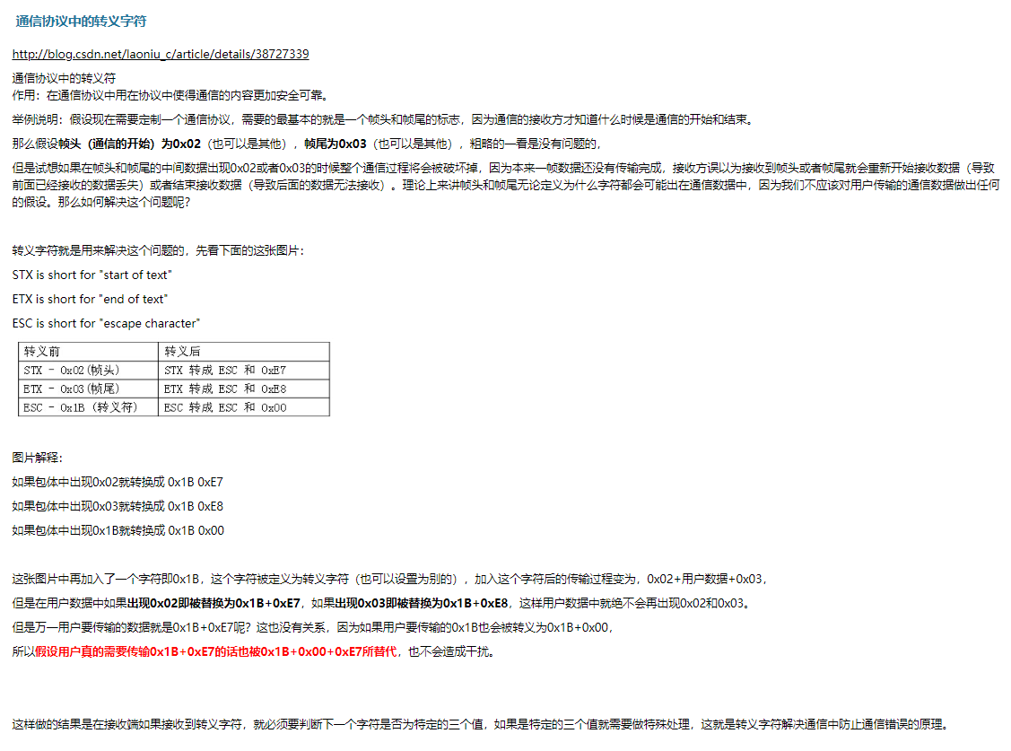 再少出现的字符由于数据帧内容的不确定性,也有可能在数据帧内部出现,例如:MODE 04 PROTOCOL协议当数据帧内部出现了0x03,0x14,也就是数据帧规定的开始部分,就必须转义,否则就会解析出错。导致一个数据帧变成两部分不完整无法理解的数据帧。