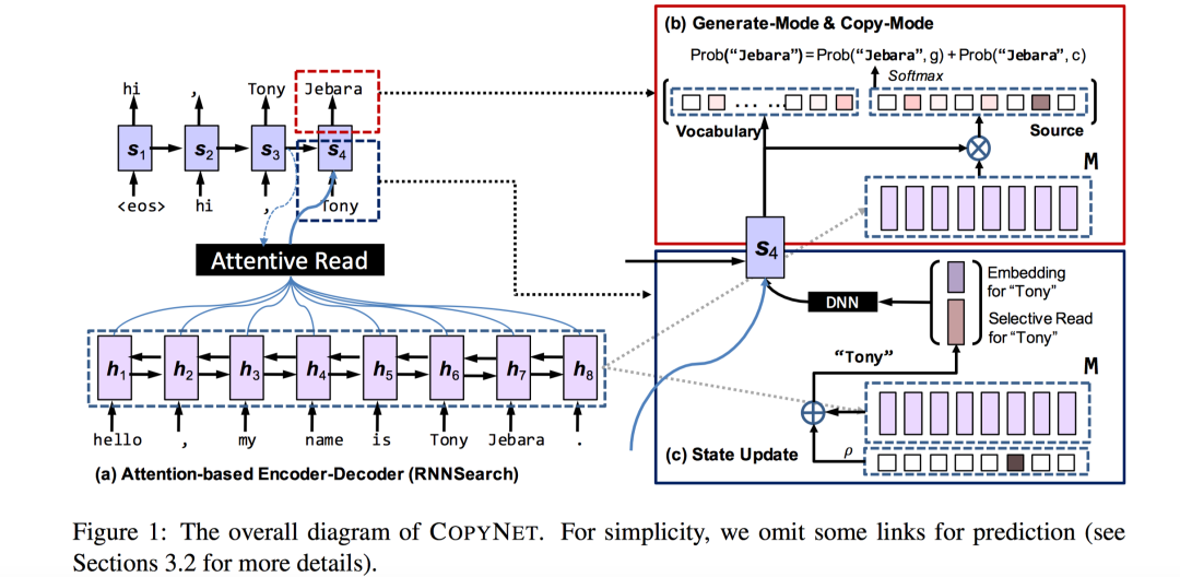 右侧下半部分,根据 , , , 更新此刻的Decoder状态 。重点是前一时刻输出词 (Tony)除了它的embedding之外,作者还考虑了如果前一时刻的输出词是输入序列某个位置的词,例如Tony就是输入序列的词,那么利用Attention向量对这些输入词的Encoder hidden state进行加权作为对输入序列的Selective Read(此处是Tony,但是Tony可能出现多次;如果没有出现,那么这部分为空,退化为传统的方法)。然后将Tony的Embedding和Selective Read连接在一起作为 。最后一起经过LSTM/GRU得到此刻的 。