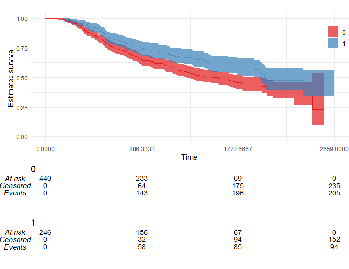 fit1 <- survfit(Surv(rectime, censrec) ~ hormon, data = brcancer)