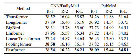 上表展示了 自然语言生成任务上不同方法的性能,Fastformer在大多数指标中都能达到最好的性能,这显示了Fastformer在自然语言生成中的优势。